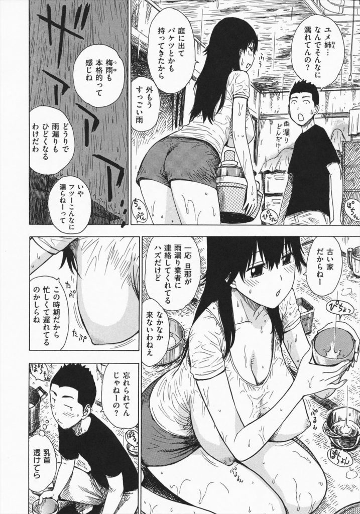 - >【エロ漫画】旦那が出張中で雨漏りしてる家に兄嫁の応援に来た義弟がお礼のキスで発情して性器の舐め合いをすると無許可挿入で寝取り!
