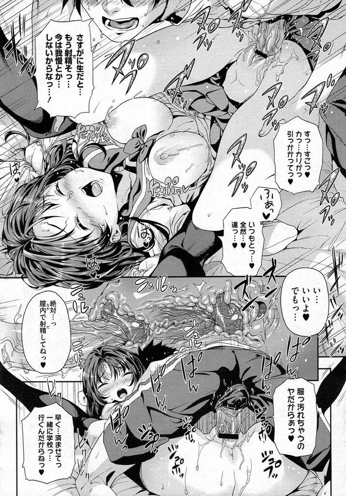 中々起きない寝ぼすけの兄にキスをして毎朝目覚ましフェラ奉仕でカリ首を甘噛みして起こす妹が時間が無いのに一発射精しないと鎮まらない朝立ちチンポをフル勃起させた兄に押し倒されてセーラ服のままナマハメするが外出しされると制服が汚れ安全日な事もありナカダシを求めて久しぶりの膣内射精をすると気持ち良すぎてそのまま連続セックス!