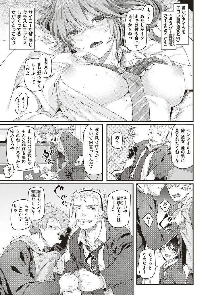 おもむろにスマホの画面を友達に自慢する男子がオナニー自撮りを送ってくるまでにエロく成長させた年下彼女を自慢すると負けじと激しいフェラ動画で本性ドスケベの同級生彼女を見せつける男子だが最後に先輩女子と付き合う男子がドSな年上彼女に弟扱いされて舐め犬になったりぞんざいに扱われて痴女責めされる事を自慢して青春を謳歌する!