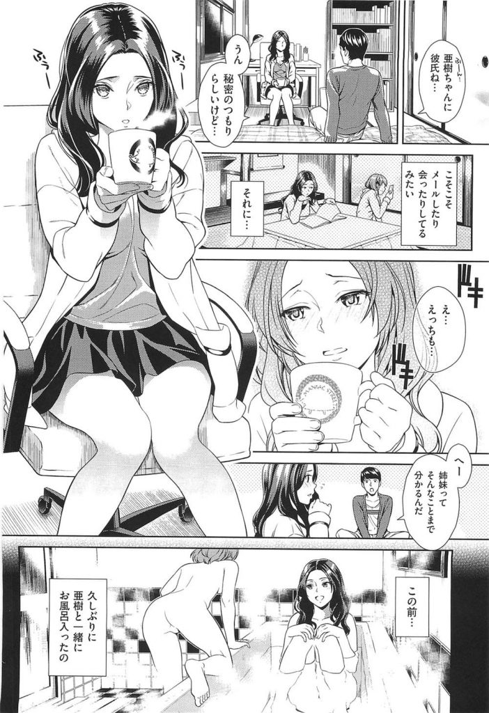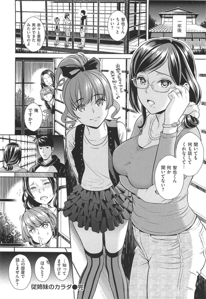 - >【エロ漫画】いとこ同士で付き合う妹に酒で酔って目の前で中出しセックスを見せられた姉が火照った体を責められ姉妹丼!