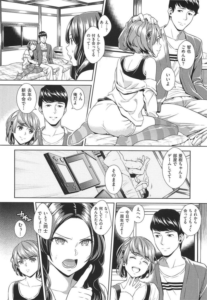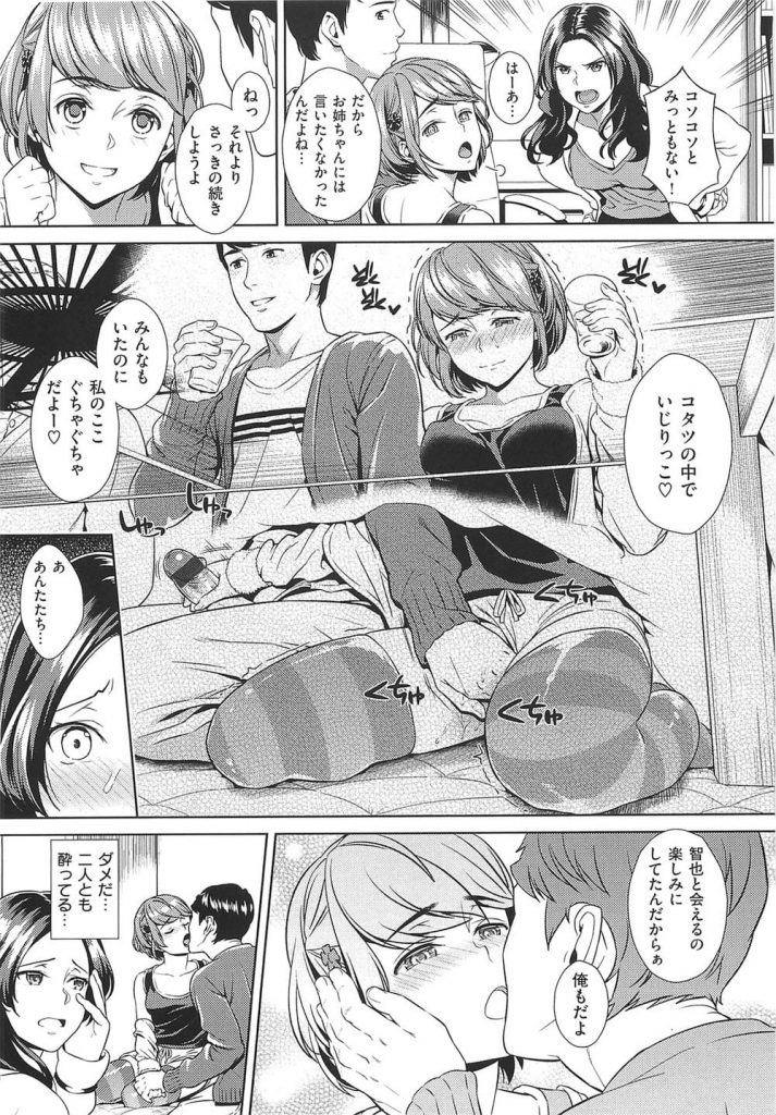 【エロ漫画】いとこ同士で付き合う妹に酒で酔って目の前で中出しセックスを見せられた姉が火照った体を責められ姉妹丼!