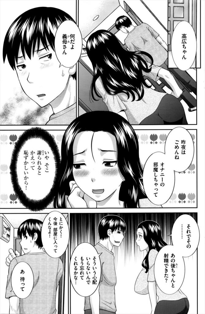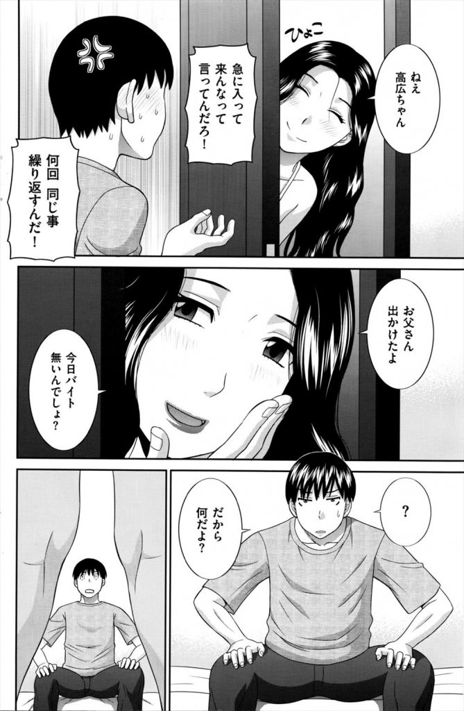 息子のオナニーを中途半端にさせてしまった母親は自分がオナニーするのをオカズにするかと息子に提案するが、断られるも裸エプロンで息子の部屋に行きチンポをしゃぶりシックスナインで興奮した息子とめでたく合体し種付けプレス!