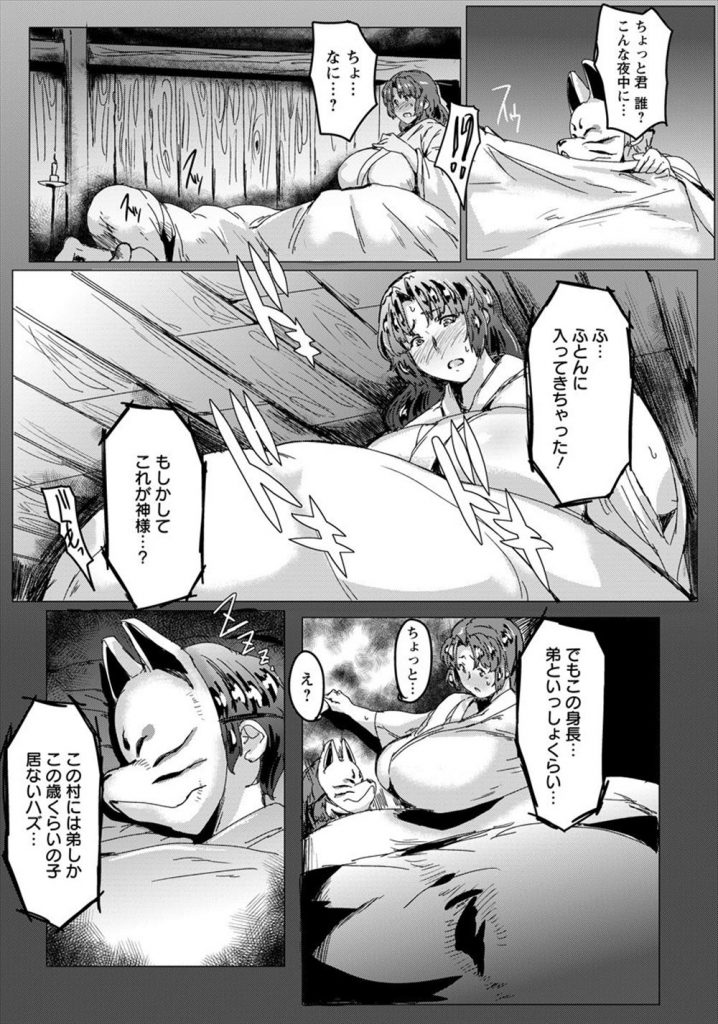 【エロマンガ】代々伝わる伝統で成人を迎える女の子が神社の本殿で一夜を過ごすがキツネ面の少年に犯される!