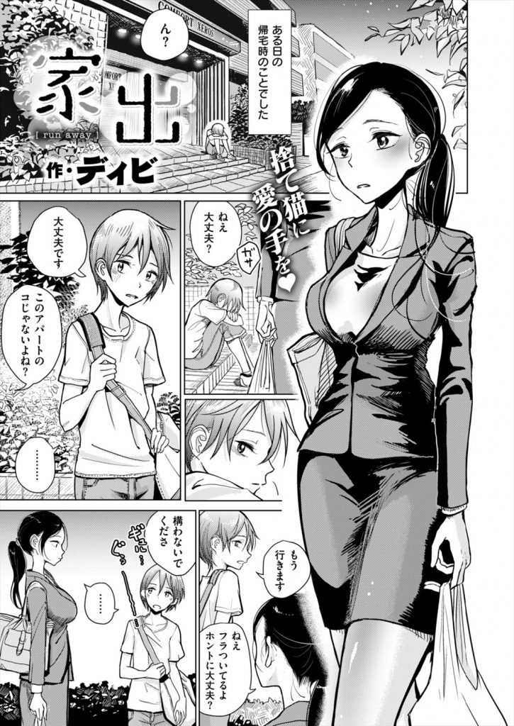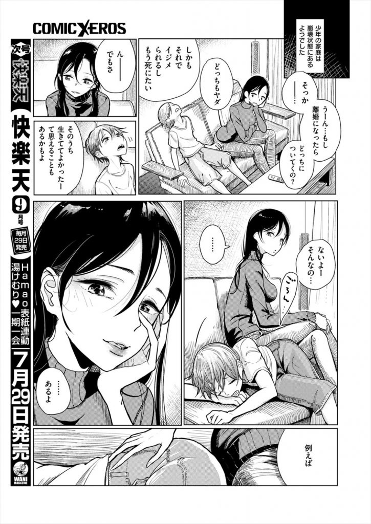 帰宅する巨乳お姉さんにマンションの前で座っている所を拾われた家出少年がご飯を食べさせてもらい落ち込んでいると癒しで抱きしめられて硬くなったペニスを顔面をオッパイで圧迫されながらテコキされパイズリされながら肛門を舐められ前立腺を延々と撫でまわされ快感に身悶えしていると我を忘れた様に責め立てられ貪欲に精液を絞り取られる!