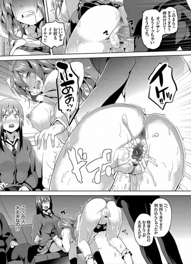 【エロマンガ】美少女JKが電車に乗ると前に立ってるOLが痴漢されてオッパイ出して本番行為!