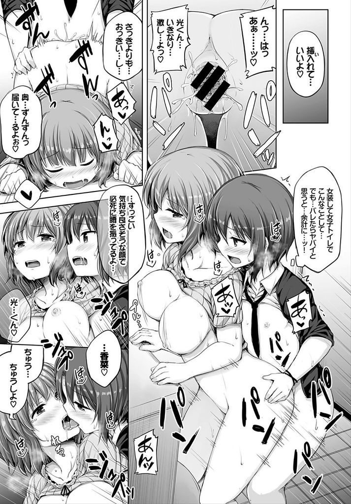 【エロ漫画】男の娘彼氏と女装デートする巨乳彼女が女子トイレでパンツコキして対面座位でイチャラブ膣出し変態初体験H!
